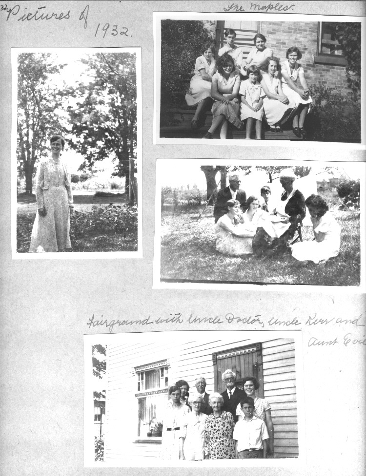 Middle: Standing and seated in front of The Maples Front (seated): Maurice Weekes, Betty Park, Douglas Park, Wm. Arthur Weekes (behind children), Kenneth Kerr, Douglas Kerr Back (standing): Ronald Weekes in front of Wilford, Catherine, Marjorie Weekes Smith, Agnes Kerr, John Smith |