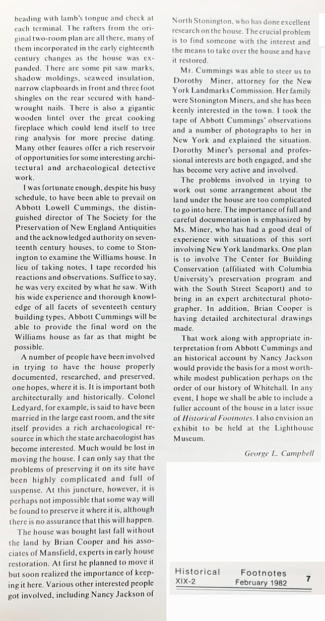 Marcus RWP note: The image linked to is p. 18 from A History of Old Mystic 1600-1999 by Kathleen Greenhalgh (1999). Errors on the page include Thomas Parke's name and the location where the house was rebuilt. On May 22, 2020, the buyer/rebuilder Brian Cooper of Early New England Restorations informed me that the house was rebuilt on Shelter Island, which is at the eastern end of Long Island, N.Y. He said when he bought the house it was the oldest house in Connecticut. The ICRC sent the following clippings about the house and the photos of the rebuilt house on May 29. |