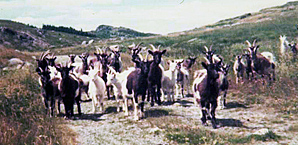 Occasionally on the road I would come across small herds of free-range goats. They were friendly but liked to stay together. I don’t remember seeing any other animals, except for one or two at a time. Perhaps the climate was too cold too much of the year. One day in my travels, outside a fairly large city (perhaps 20,000), I sort of lost my way. I don't know how it happened, but I missed the road through town that I was supposed to follow. Instead of sailing through without any confusion, I ended up stuck in a sudden parade of cars all headed the same direction down a side road. A traffic jam in Newfoundland? Impossible! But I was stuck with them for a while and had to follow the herd until I could right myself and return to the main street. The line of cars proceeded across an actual airplane runway, turned around a hill and there it was! Where everyone was headed. This was the time of morning that the work-shift changed at the enormous fish processing plant, where about three hundred people worked at one time. It may have been a cannery too. I knew I was not on the work schedule that day, so after a while I was able to break away from the procession and turn around. A few other cars were going out, too, so I was not alone in my purpose. I was just about back around the bend again when workers on foot stopped all the cars in both directions. So we had to wait. Why became obvious as the noise of an approaching propeller airplane came out of a cloud. Soon, a small, single-engine, probably 18-seater plane appeared, growing closer and closer to the runway. The cars looked awfully near to their flight path, but the workers knew what they were doing, and the place landed safely in front of us, then taxied to a warehouse down the way. The workers motioned us to go on again, and soon there was another traffic jam with most of the cars coming at me. There were lots of fish plant employees yet to arrive, and I was pleased to get free of them all. In town again, I found where I should have followed a different street through the three-block downtown area. That was about 45 minutes out of my day which I could never recover. Toward evening on another day, having found a nice open space in the woods to park my van for the night, I happened to fall in with a group of four travelers who were staying at a nearby campground. They drove into the same area I was settled, and they curiously asked me about ending up so far away from Minnesota. They were nice people from Ontario. I told them I was born there. It was through them that I later found myself in a rented boat with them not far from shore. The boat had a small outboard motor on it, but the boat was just drifting in the water for what we were up to. We all had in our hands strong fish lines attached to substantial sharp hooks about three inches long. We were all learning how to catch ocean fish by "jigging." This is a simple process where people hang the lines overboard, and yank the lines up about two feet, over and over again. The fish get curious and swim up to the shiny, fast-moving objects. Once in a while, they get impaled by someone's hook. I caught a flounder that way, my first. It was about a foot and a half long! No one else caught anything that time, so we all took my flounder back to their campground and fried it in a pan on their fire. It was big enough for us all to have a meal, with some fried greens. What an exciting event for someone who had never before been on a small boat on the ocean. A couple of days later I was invited by the same people to go down to the shore and meet a young genuine Newfoundland fisherman. This guy had been born into this life-he, his parents, and his brothers, all made their living this way. With encouragement from the Ontarians who had met him a couple of days before, we were given a demonstration by a real pro of how to clean and fillet a fat freshly-caught codfish over two feet long-in record time. At about age 22, this guy's strength and skill was amazing to behold. He had everything set up already: the fish on a clean table with plates, knives and a bucket to contain the non-useable fish parts. One of the onlookers looked at his watch and suddenly yelled, "GO!" The Newfoundlander surprised everyone by bending the fish's head completely backward and snapping it off with both hands. The fish spine made a big, broken-branch sound as he performed this move. Then he dressed the fish, getting rid of all the innards with skillful knife thrusts, and soon he was delicately, with lightning speed, cutting through the skin and folding it back to get at all the flesh waiting there. He produced what seemed to be about ten fat fillets from each side of the fish, probably at least fourteen pounds of codfish for the open-air market in town. His time: 2 minutes and 15 seconds. It was the most amazing fish filleting demo I had ever seen. Wow. Okay, I may not have seen many of those, even on TV. Newfoundlanders talk with a strong accent, sort of an off-shoot of Irish with a twist. It was mostly understandable, but some people were unintelligible to me when they talked fast. I once asked a store clerk how to get to a nearby town called English Harbor. He said. "Angleesh Harba?" He pointed in the direction I was to drive. "Ye go bock to ta meen rood, fur aboot three moiles…" ("You go back to the main road, for about three miles…"). I once picked up a hitch-hiker in his early twenties who had an interesting way of making all his verbs in third person, apparently a common practice in some parts of Newfoundland. I asked what he did for a living, and he told me, "I works for the provincial schools. I travels around from school to school helping set up during summer, and in fall, I teaches." Fourth grade kids, it turned out. He asked me, "Did you land in Newfoundland?" by which he meant did I move there. "No, I'm just visiting," I told him.
