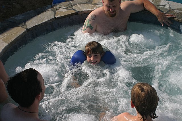 Mischa, Matt and Christopher watch Jonathan's shirt fill with air bubbles in the hot tub.