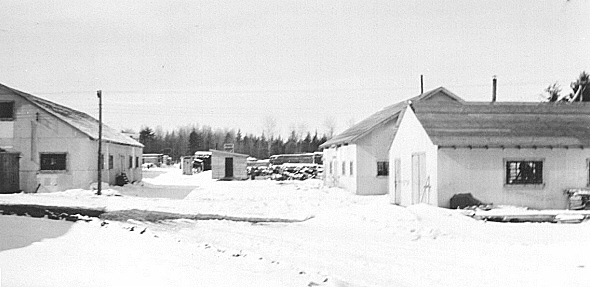 Construction buildings on the Common, looking west from the school, March 10, 1946