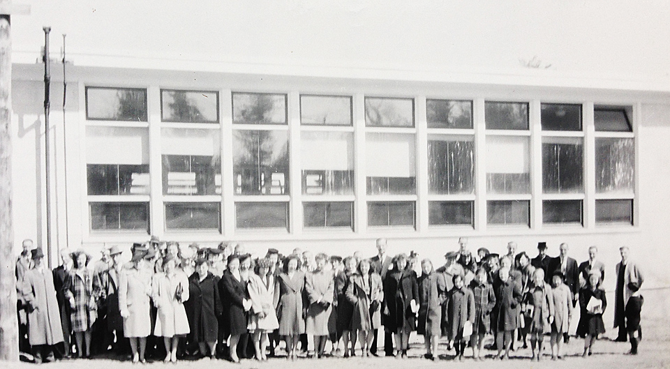 People attending a meeting of the Deep River Community Church outside the school, late 1946