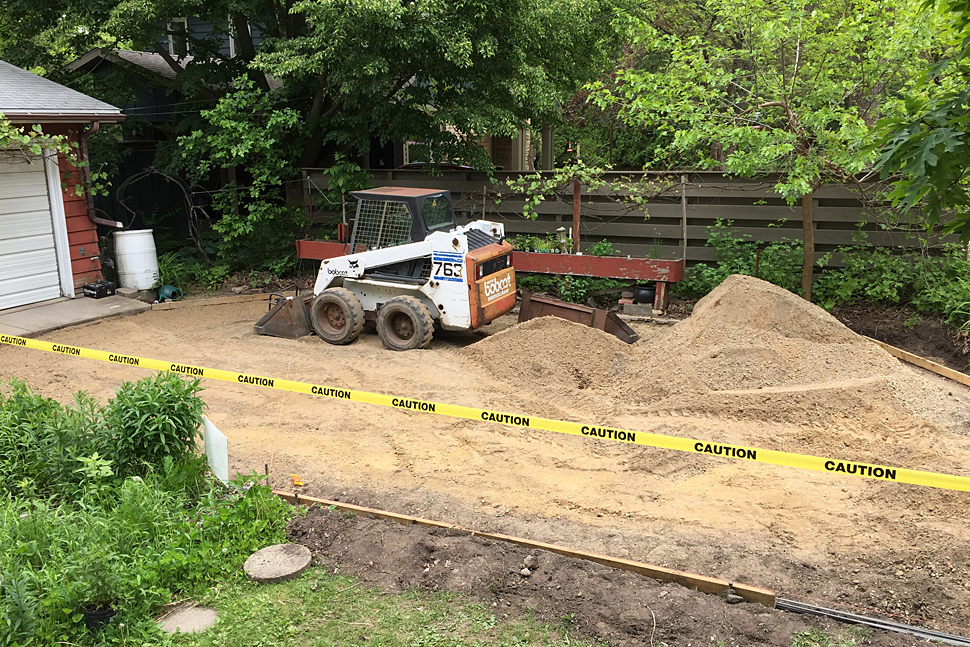 With the asphalt removed, the sandy gravel that had been beneath it was leveled off. Some of it was hauled away.