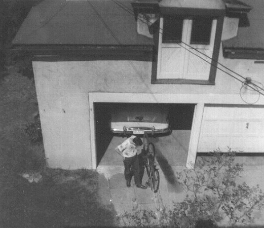 James working on his bicycle in front of the garage, 1959. By this time the original garage door, which slid to the left, had been replaced with 2 overhead doors.