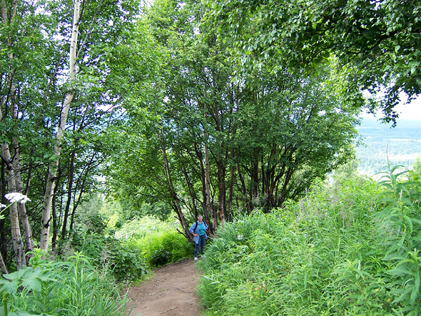 Barbara on the Lazy Mountain Trail. The trail brochure warned that rain made the trail muddy and slippery, so when we saw rain approaching in the distance she started back down. 7/26/06