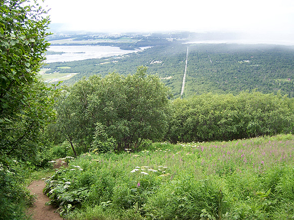 Farther up the Lazy Mountain Trail, with the highway to Palmer stretching across the valley below in the middle of the picture. The rain can be see approaching on the right. 7/26/06