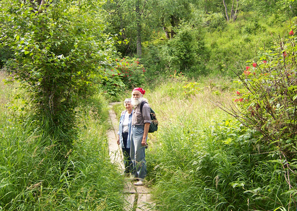 Barbara and Robert at the first (and longest) of 6 wooden plank footbridges over small streams along the Pioneer Ridge-Knik River Trail.