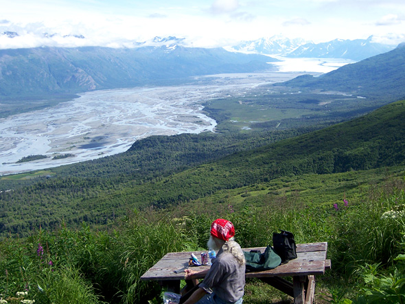 Looking down to the Knik River valley and the Knik Glacier from above the picnic table near the 1200 ft. level of the