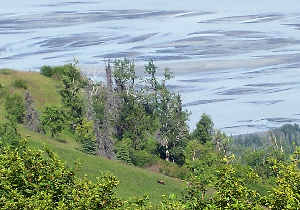 Moose grazing in a meadow below the Pioneer Ridge-Knik River Trail. The sprawling riverbed of the Knik River