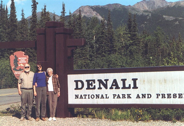 Warren, Patty and Nona at entrance to Denali National Park.