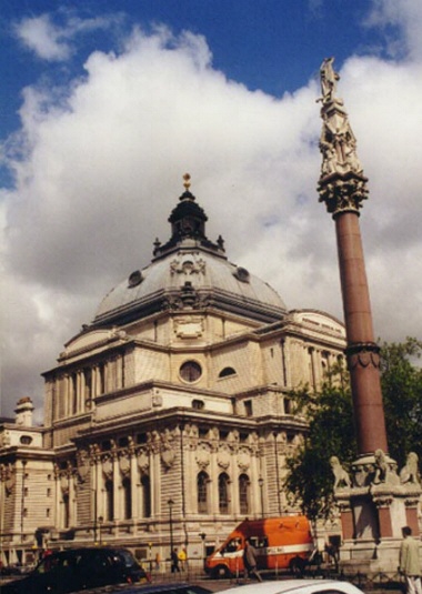 In London's Trafalgar Square, Lord Nelson stands on a dizzying pedestal; the old Methodist Guild Hall in the background.