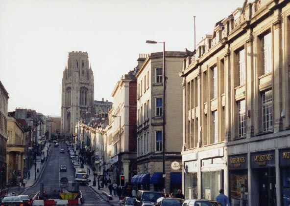 A main avenue in Bristol, with another cathedral in the background.