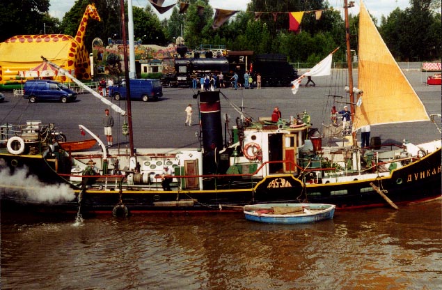 Odd old-fashioned small Russian boat along the canal (carnival in the background).
