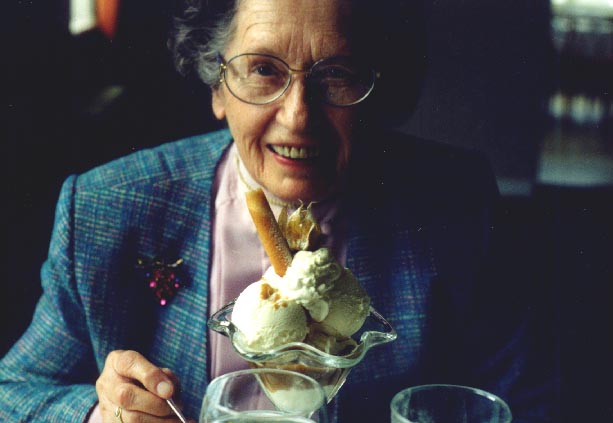 Evelyn at a restaurant in Pori looking forward to her special ice cream dessert.