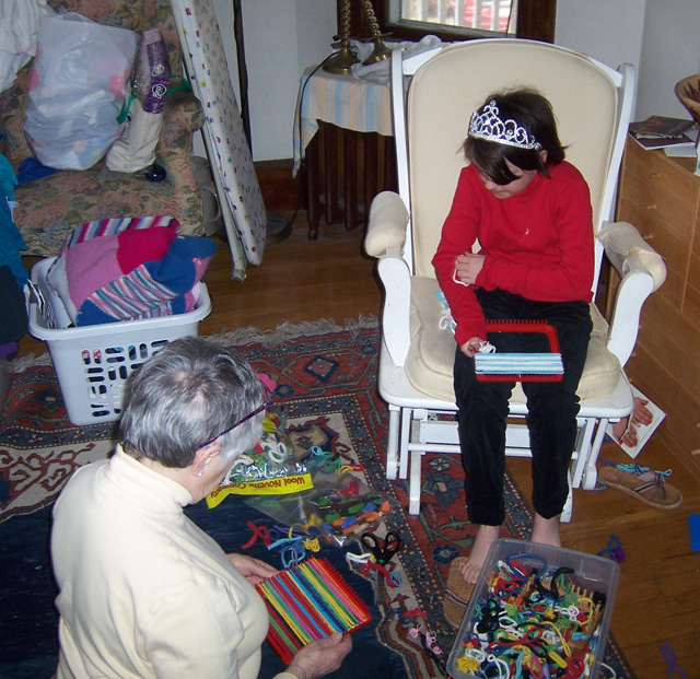 Barbara and Tavery making pot holders to give Margot at her birthday party