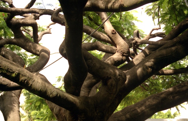 This tree grows in the yard at Casa CEMAL, the study site building owned by Augsburg College in Cuernavaca. The tree is huge with very smooth bark and twisty branches. Is it a baobab tree? Does anyone know?
