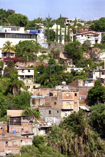 A closer view of the buildings and houses built into the hillside across the gulch from Universal Language School.