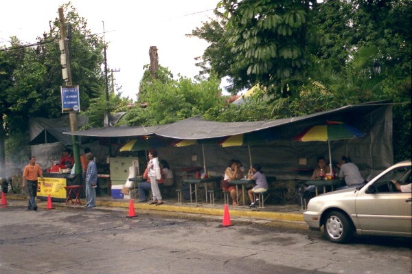 Here is the same street corner as #071 but now it is a hamburger grill and sidewalk cafe. In fact, this whole cafe sets up and takes down every day, late afternoon until late into the night. The grill, the tables & chairs, the canopies are all trucked in and out daily.