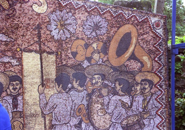 This real beautiful mural is actually made from different colors of corn,, rice, beans and other grains stuck into the wall at the gate to the church yard in Tepoztlan.