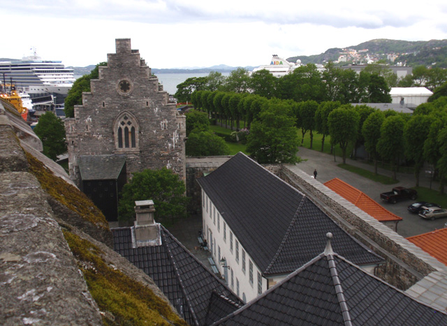 111. View from medieval Rosenkrantz Tower to the adjacent King Haakon’s Hall hunting lodge, both 13th century, within the old fortress for Bergen.