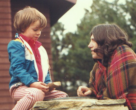 Barbara explains how the sundial works as Mischa sits on it at Camp Upham Woods, 1982